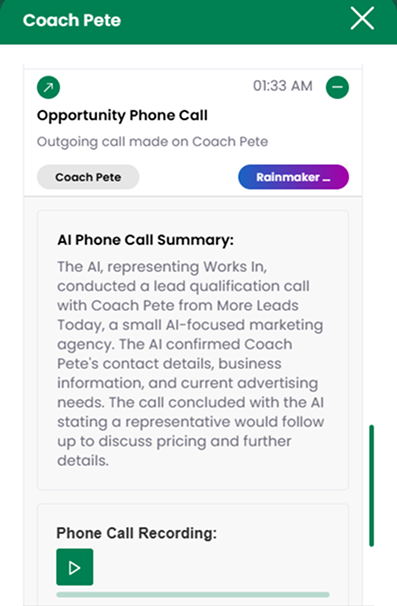 Hear every conversation, anytime. All Rainmaker™ calls are recorded, organized, and stored for you to review, track quality, and improve your follow-ups. All phone calls include an AI phone call summary.