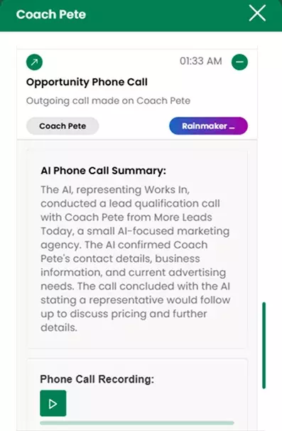 Hear every conversation, anytime. All Rainmaker™ voice AI calls are recorded, organized, and stored for you to review, track quality, review AI instant lead qualification and improve your follow-ups. All phone calls include an AI phone call summary.