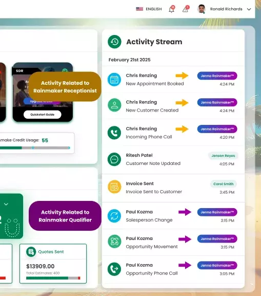 See every move Rainmaker™ voice AI or your sales team makes across customers, phone calls, emails, opportunities, and more. One simple feed with every customer touchpoint, perfectly organized and easy to follow.